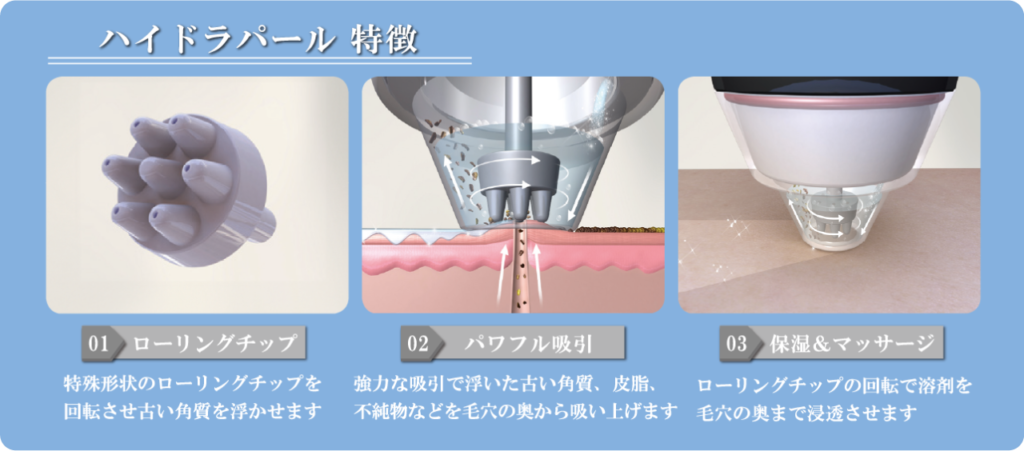 角質除去、毛穴ケア、美容液導入の3種類のケアが同時にできる最新のスキンケアトリートメントです。