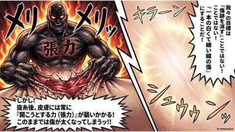 しかし皮膚は常に開こうとする力(張力)が加わっているため、縫合後に抜糸をしてからもその張力によって傷が開く方向に引っ張られ、幅の広い傷跡になってしまうことがあります。