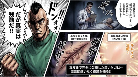 その後数年たっても傷跡が残っているということは間違いなく皮膚の構造からすると真皮~皮下組織までの破壊が生じていることが分かります。