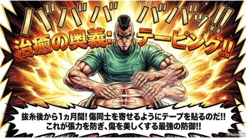 そこで少しでも一本の腺の様な傷になるよう我々は抜糸後の傷に対してさらにそこから1ヵ月の間、傷同士を寄せるようにテーピング処置を行うことを患者さんにご説明しています。