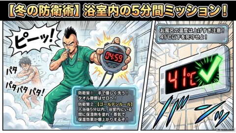 - お風呂の温度を上げ過ぎない。できれば41℃以下を心がける。