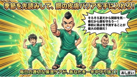 また保湿剤の種類についても、夏はべたつくのがやだからさっぱりとしたローション系を中心に使用したり、冬はしっかりと保湿効果を高めたいからモッタリとした軟膏系を中心に使用したりと使い分けるなど季節に応じて使い分けることも、継続したお肌のバリア機能維持につながりますよ!