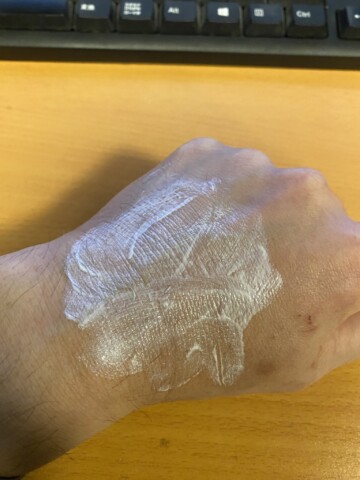 そして手、顔に塗ってみた感じですが、塗り心地自体は悪くありません。普通のクリームという感じです。